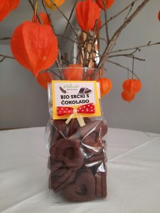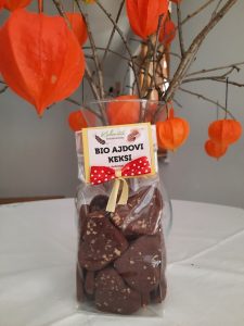 Sestavine; ajdova moka, kakav, agavin sirup, kokosova maščoba, vinski kamen, vanilijin sladkor. POLNILO; čokolada, lešniki, sladkor
